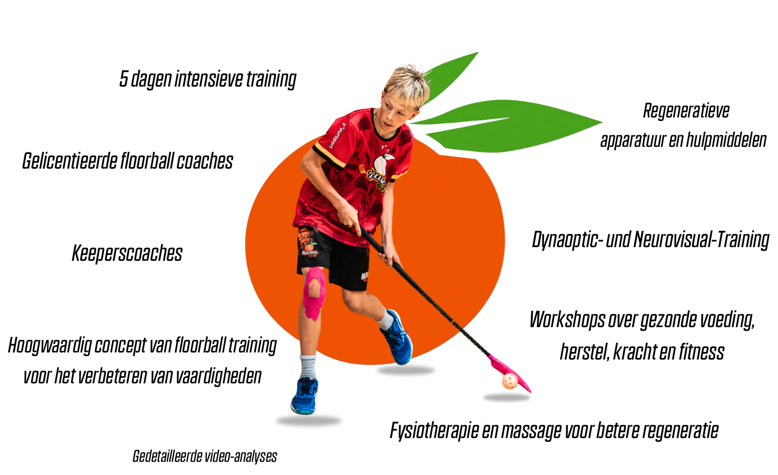 Peaches Camp gaat niet alleen over floorball – het is een uitgebreide sporttraining die spelers helpt niet alleen hun techniek te verbeteren, maar ook hun fysieke conditie, regeneratie en mentale set-up. Performance bestaat niet alleen uit floorball training, maar uit vijf kerngebieden die samen een succesvolle atleet vormen.
